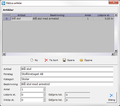 Välj Fiktiva artiklar i Verktygs-menyn. Dialogrutan Fiktiva artiklar visas (se figur 1 nedan).