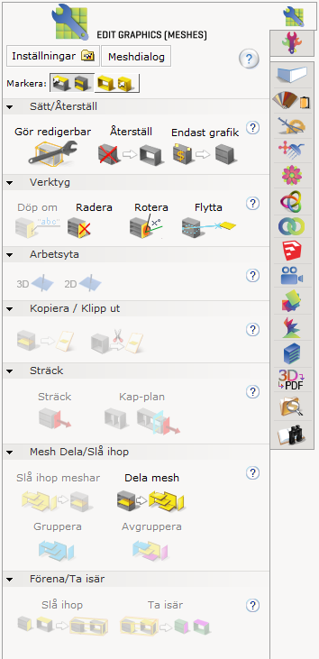 En vanligt förekommande term är mesh, vilket kortfattat är ett grafiskt element (för avancerade användare: en grupp av polygoner). Meshar kan variera mycket i storlek. Ett helt bord kan utgöra en mesh, medan bara ett bordsben kan utgöra en annan mesh. I Edit Graphics går det att göra förändringar både på komponentnivå och på meshnivå.