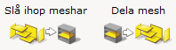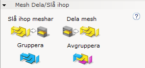 Avdelningen Mesh Dela/Slå ihop innehåller fyra verktyg för att kombinera och separera meshar på olika sätt. Dessa funktioner kan också nås från Mesh-dialogen.