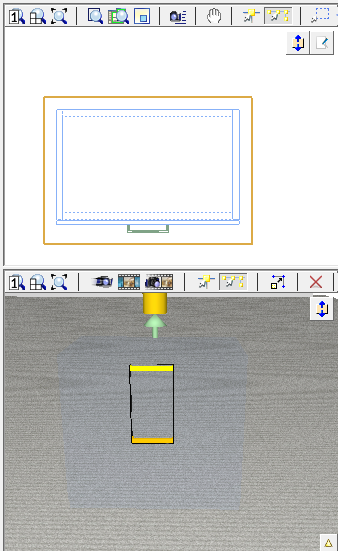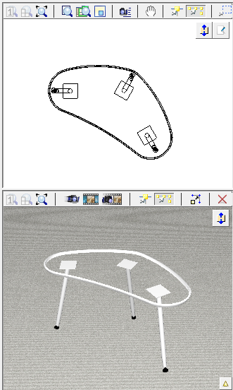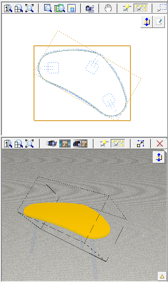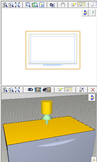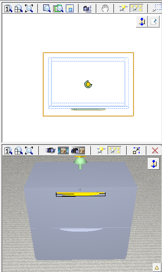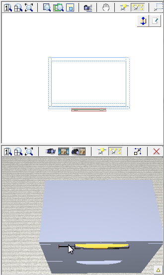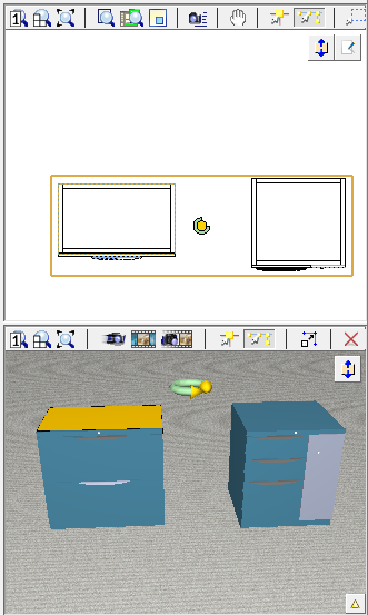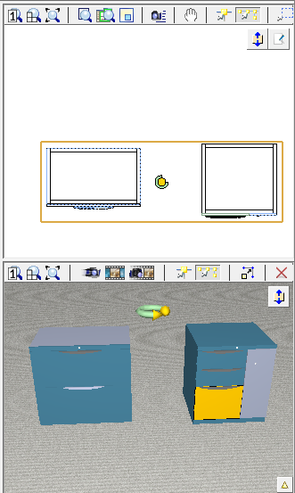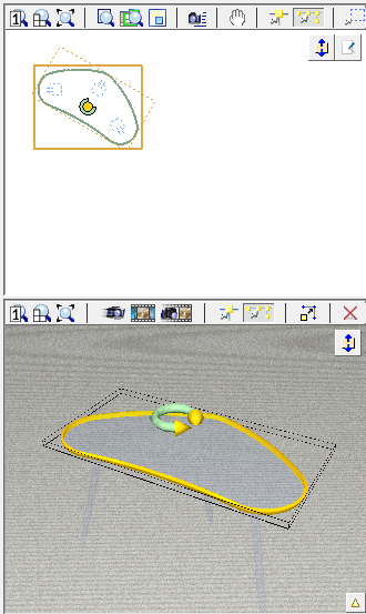 Klicka på relevant knapp för arbetsplan; det finns ett verktyg för 2D-vyn som opererar på X- och Y-led; samt ett verktyg för 3D-vyn som opererar på X-, Y- och Z-led.