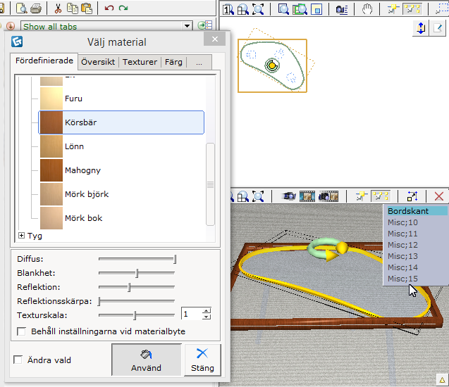 När du byter material visas det namn du valde i listan över meshar, vilket gör meshen enklare att identifiera och välja. |