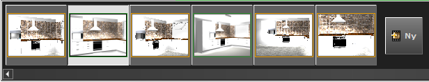 Första gången som Fotolabb öppnas i en ritning så visas en startruta som består av din nuvarande 3D-vy, en menyrad och ett område för miniatyrbilder. Längst ner ser du en Ny-knapp, och du uppmanas att starta genom att lägga till fotografier. När du klickar på Ny så skapas ett foto som du kan arbeta med, och du kommer även att se att utseendet på Fotolabb förändras. Nu visas istället ett enkelt eller avancerat läge för bildbearbetning, beroende på vilket läge som var aktivt senast Fotolabb var öppet.