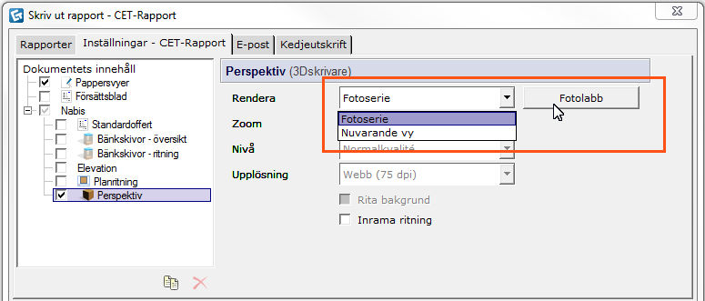 Markera kryssrutan Perspektiv som du hittar under Standardoffert på fliken Inställningar - CET Rapport.