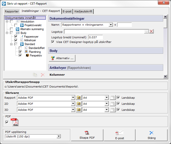 För att skriva ut rapporter och ritningar i CET Designer gör du på följande sätt: