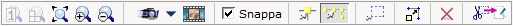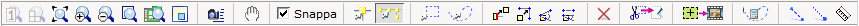 De två verktygsfälten ovanför 2D- respektive 3D-vyn (se Figur 1 respektive 2 nedan) i CET Designer innehåller ett antal funktioner som gör det enklare att zooma, navigera och manövrera objekt i de två vyerna. Om du håller stilla muspekaren över en knapp visas en text som ger en beskrivning av den aktuella funktionen.