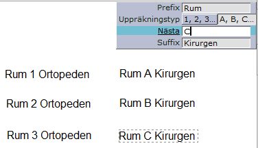 Om du vill ändra egenskaperna för Prefix, Uppräkningstyp, Suffix eller Värde använder du tabtangenten för att hoppa från fält till fält. För att skifta mellan siffror (1, 2, 3...) och bokstäver (A, B, C...) använder du mellanslag.