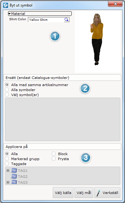 Egenskaper: (Obs! Det här är symbolen som kommer att ersätta målsymbolen vid klick på Verkställ)