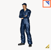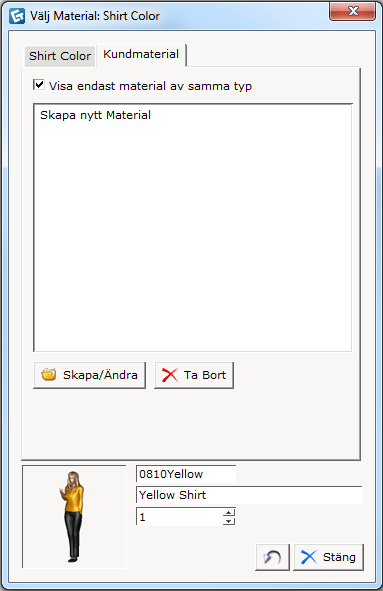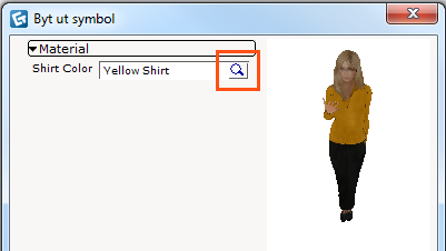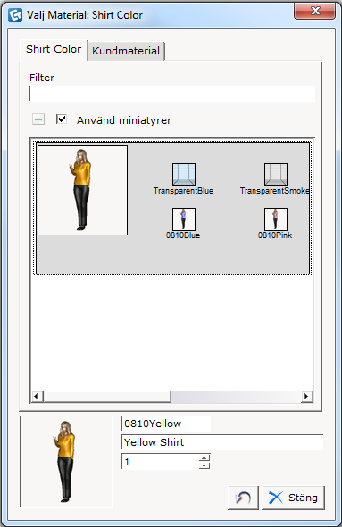 Namnet på första fliken i dialogen Material Select ändras beroende på vilken symbol du har markerat. I det här fallet är en kvinna med tröja markerad och på så sätt blir namnet på fliken Shirt color. På denna flik kan du bläddra efter vilket material du vill använda på en symbol. Alla tillgängliga material för en symbol kommer att visas här, antingen som miniatyrer eller som detaljerad lista. På botten av dialogen finns detaljerad information om det nuvarande materialet, namn och beskrivning.