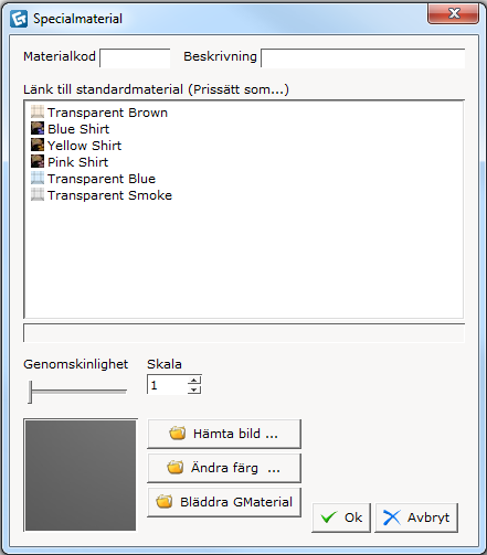 I dialogen Välj Material kan du ändra material på symboler, redigera redan befintliga material och skapa Kundmaterial. Välj Material nås från dialogen Byt ut symbol eller från inmatningsrutan för varje symbol (se figur 3 och 4 nedan).