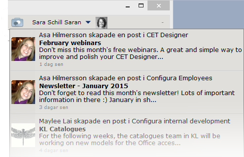 Configura använder MyConfigura för att skicka ut viktig information såsom uppdateringar, release notes och tips av olika slag. Du når dina meddelanden via menyn längst upp till höger i programfönstret. En briefcase-symbol med en räknare visar hur många nya meddelanden du har, och om du klickar på symbolen visas dina fem senaste meddelanden på MyConfigura. När du klickar på ett meddelande öppnas det i MyConfigura i en webbläsare.