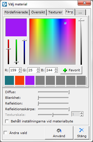 I dialogrutan Välj material finns en flik som heter Färg (se figur 1). Här kan du blanda och skapa dina egna färger för att sedan spara dem som favoriter.