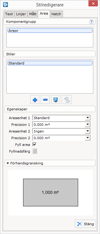 På fliken Area i Stilredigeraren kan du skapa nya och ändra fördefinierade Stilar för den area som ritas upp när du använder verktyget Beräkna område.