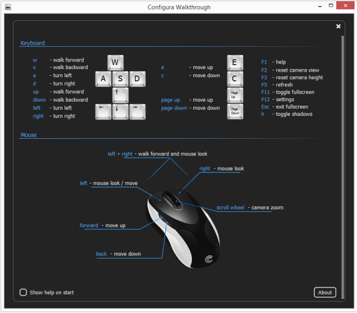 The first time you open Configura Walkthrough, a help screen is displayed. You can then choose whether or not to show the help on start by clicking a checkbox. Whenever you want to open the help, just hit the F1 key or click the question mark at the bottom of the Walkthrough window.