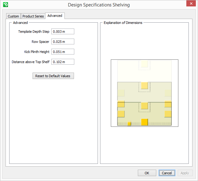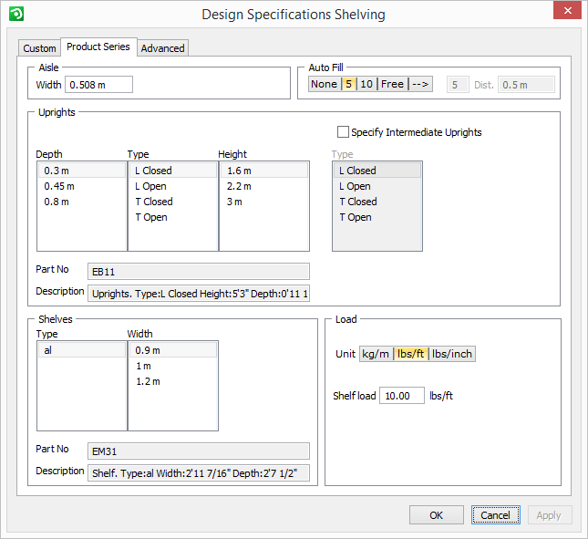 Clicking on the Design Specifications button below, will open a dialog called Design Specifications Shelving.