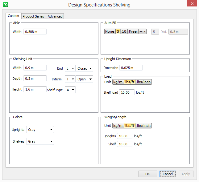 The Custom tab contains seven main fields (Aisle, Shelving Unit, Colors, Auto Fill, Upright Dimension, Load and Weight/Length), in which different settings can be applied.