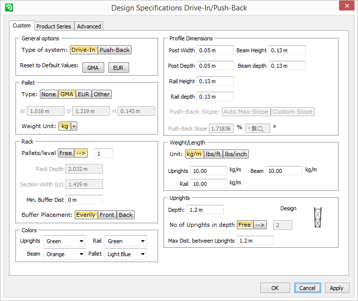 The Custom tab contains seven main fields (General Options, Pallet, Rack, Colors, Profile Dimensions, Weight/Length and Uprights), in which different settings can be applied.