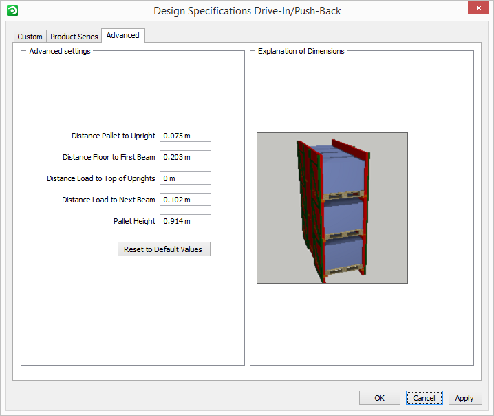 Custom - this tab is only available when you have selected the Customized option at the top of the Drive-In/Push-Back component tab. Here you customize a drive-in or a push-back system from the start.