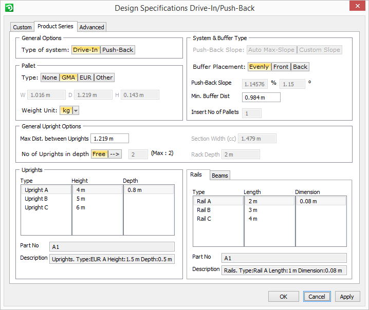 The Product Series tab contains six main fields (General Options, Pallet, System & Buffer Type, General Upright Options, Uprights and Rails/Beams), in which different settings can be applied.