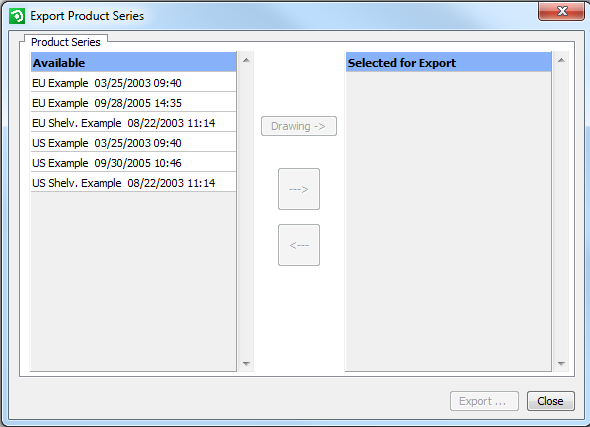On the left-hand side all your available product series are listed. To select one or several product series for export, click on one at a time and then click on the button with a right-facing arrow. Alternatively, you can simply double-click the product series.