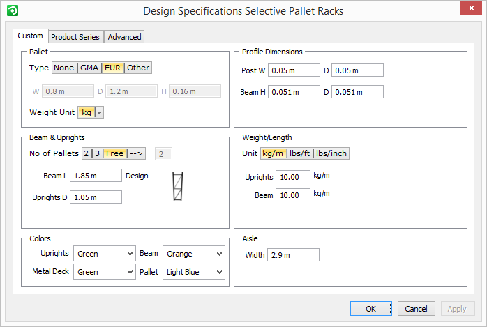 The Custom tab contains six main fields (Pallet, Beam & Uprights, Colors, Profile Dimensions, Weight/Length and Aisle), in which different settings can be applied.