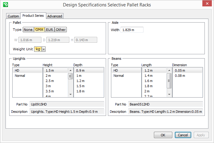 The Product Series tab contains four main fields (Pallet, Uprights, Aisle and Beams), in which different product series settings can be applied.