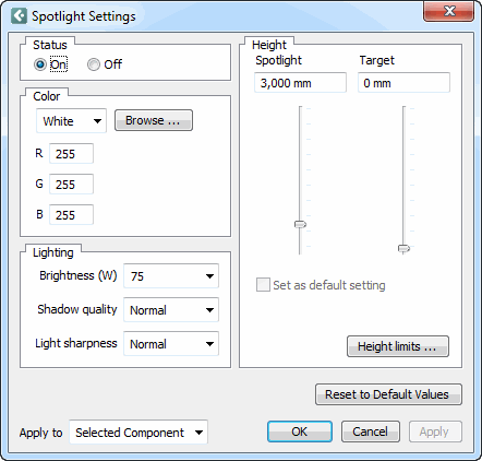 In the Height field, you can adjust the height of the Spotlight and the Target. Drag the sliders or enter the height you want in the text boxes. If you click on the Height limits button, you open the dialog Height Limit Settings. In this dialog, you can set the upper and lower limits for the height of the spotlight.