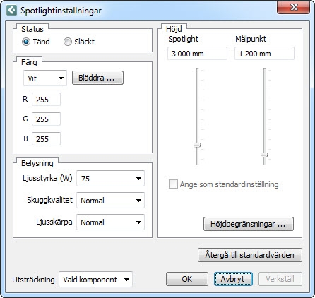 Genom att dubbelklicka på spotlighten visas dialogrutan Spotlightinställningar. Här kan du bland annat ange spotlightens höjd och ljusstyrka.