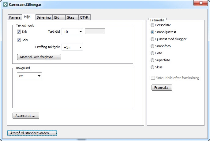 Observera: Om ingen av kryssrutorna Tak respektive Golv markerats avaktiveras knappen Material- och färgbyte samt de nedrullningsbara listrutorna Takhöjd och Omfång tak/golv. Om bara kryssrutan Golv markeras avaktiveras listrutan Takhöjd. |