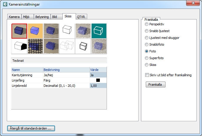 Från fliken Skiss i dialogen Kamerainställningar är det möjligt att välja olika teckningstekniker för rendering av ritningar. Fliken innehåller ett antal icke-fotorealistiska tekniker som gör det möjligt för dig att välja den mest lämpade stilen för din design.