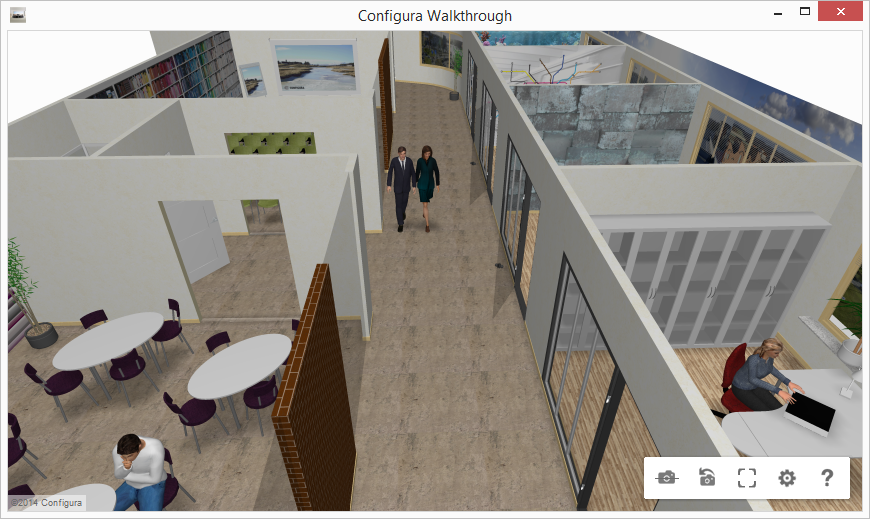 Vill du visa din kund exakt hur deras lokaler kommer att se ut? Med Configura Walkthrough kan du det! Med ett tangenbord eller en mus kan du förflytta dig i 3D, gå framåt och bakåt, stiga med kamera och svänga 360 grader.