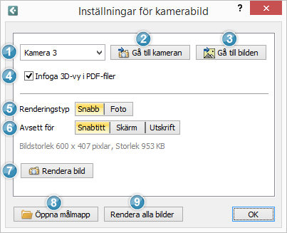 För att rendera den kamerabild som är markerad, tryck på knappen Rendera bild. |