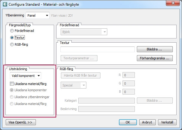 I dialogrutan Configura Standard - Material- och färgbyte finns den nedrullningsbara listrutan Utsträckning. Här väljer du vilka komponenter som ska byta material och färg samtidigt. Det kan vara en komponent, en grupp av komponenter, komponenterna i en position, eller alla likadana komponenter på ritytan.