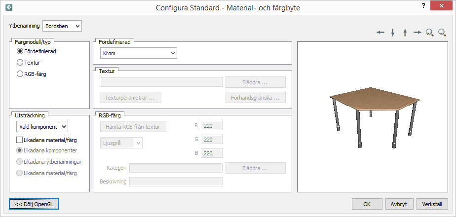 Om du ändrar materialet på till exempel ett arbetsbord i Configura ser du förändringen direkt i 3D, förutsatt att du har fönstret synligt. I det läge då du har det synligt ändrar knappen namn till Dölj OpenGL och används för att dölja fönstret igen.