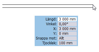 Om du ska placera ut en linje med ett exakt mått är det enklast att arbeta från tangentbordet och ange måtten i den inmatningsruta som visas efter att du valt komponenten och klickat en gång på ritytan.