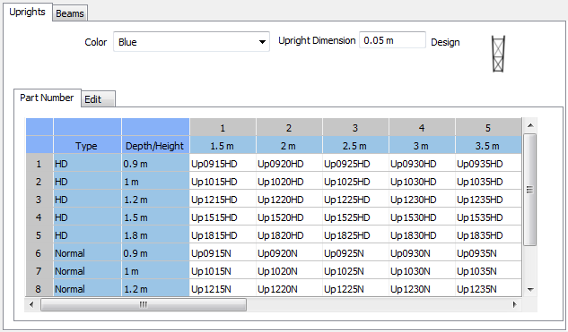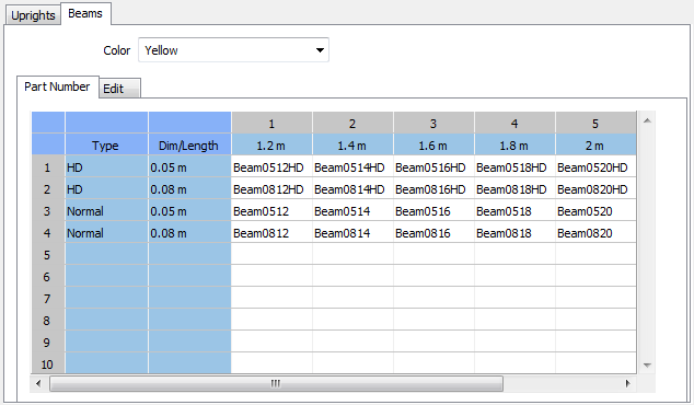 The Uprights tab together with the Part Number tabs are pre-selected. This is where you specify the available upright dimensions for the product series that you would like to create. In order to specify the dimensions of the beams, select the Beams tab and create the appropriate entries. When all of the information has been entered in the administrative tool and the new product series is saved, it will appear as an option in the Product Series choice on the Selective Pallet Racks component tab.
