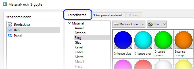 fördefinierade färger och material: