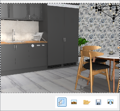 In the toolbar that pops up in the viewing area there is an Area selection tool, with a functionality similar different snipping tools. Using the Area selection tool, you can easily highlight certain areas in your renderings, which can then be saved, copied to the clipboard, or inserted in the drawing area.