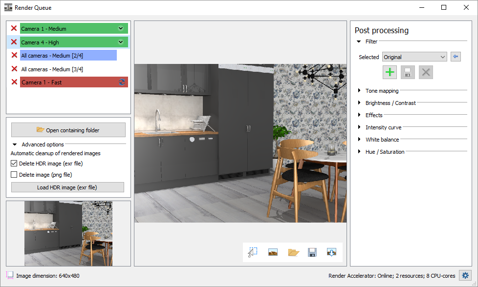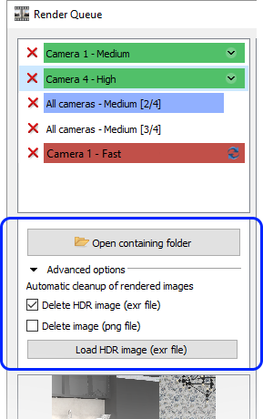 All renderings are saved in two image formats in the Render Queue folder - .png (normal image) and .exr (HDR image). The reason for saving .exr images as an addition to the normal images is to enable post processing in Configura or other photo editing software. If you have added any post processing effects, however, this is reflected in the .png file. To apply post processing to a rendering that is no longer available in the list in the Render Queue, use the Load HDR image button found to the left in the Render Queue dialog.