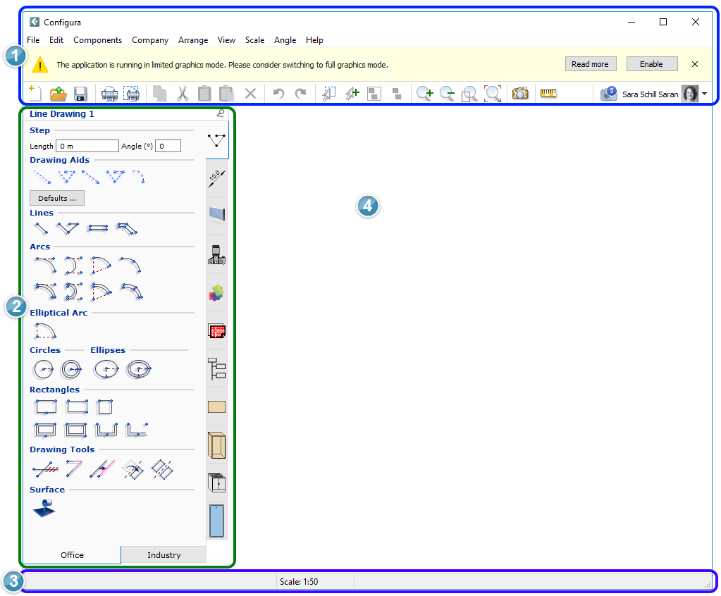 The different component tabs to the left of the drawing area contain all the components and features in the program that can be placed on the drawing area. There is a vertical row of tabs (see the figure above) which has a range of icons and a horizontal row with two main tabs: Office/Home and Industry. Select the Office/Home tab if you want to work with generic office components and the Industry tab if you want to work with generic industrial components.