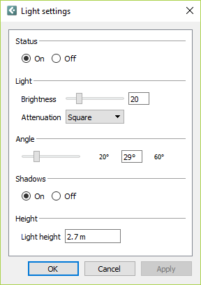 Lights that can be aimed at something, such as the spotlight, have two height settings; one for the actual Spotlight and one for the Target. They also have a Height range where it is possible to specify the allowed range for the light.