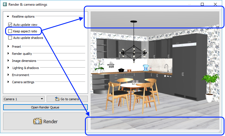 Keep aspect ratio: selected by default, which means that the relationship between the image width and height, as stated for the selected Image Dimension, remains when resizing the dialog. Deselecting the checkbox will make Configura disregard of this relationship and allow the image to fill the entire Realtime view: