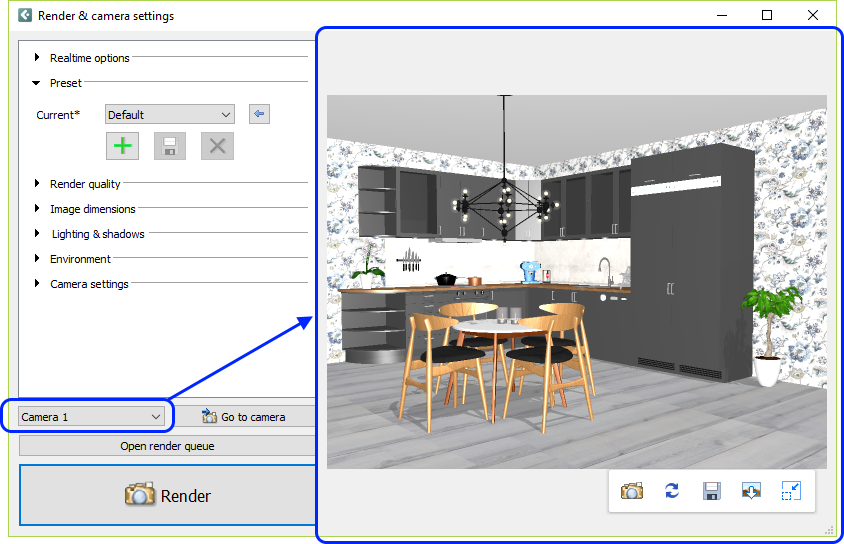 The main part of the Render & camera settings dialog consists of a Realtime view where you can see what the currently selected camera is capturing: