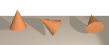 ConeIn the Cone Settings dialog, you can specify the Height and Radius, together with the Vertical position of the cone. (The Distance to floor is the distance between the cone and the floor.) In the two fields for Rotation, you can enter values (number of degrees) for rotating the cone. In the figure the cone to the left is not rotated. The values for the Y-Axis and Z-Axis are set to 0. However, the Distance to floor has been set to 500 mm, so the cone is suspended above floor level.