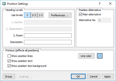Checking the box Show position text... will show the text that you have entered in the different heading levels above on the printout. The option is valid for all positions on the printout.