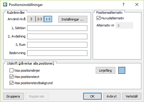 Om du bockar för kryssrutan Visa positionstext... visas den text som du har skrivit in vid de olika rubriknivåerna vid utskrift. Valet gäller för samtliga positioner på utskriften.