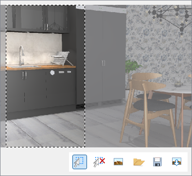 In the toolbar that pops up in the viewing area there is an Area selection tool, with a functionality similar different snipping tools. Using the Area selection tool, you can easily highlight certain areas in your renderings, which can then be saved, copied to the clipboard, or inserted in the drawing area.