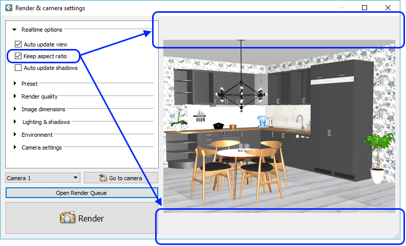 Keep aspect ratio: selected by default, which means that the relationship between the image width and height, as stated for the selected Image Dimension, remains when resizing the dialog. Deselecting the checkbox will make Configura disregard of this relationship and allow the image to fill the entire Realtime view: