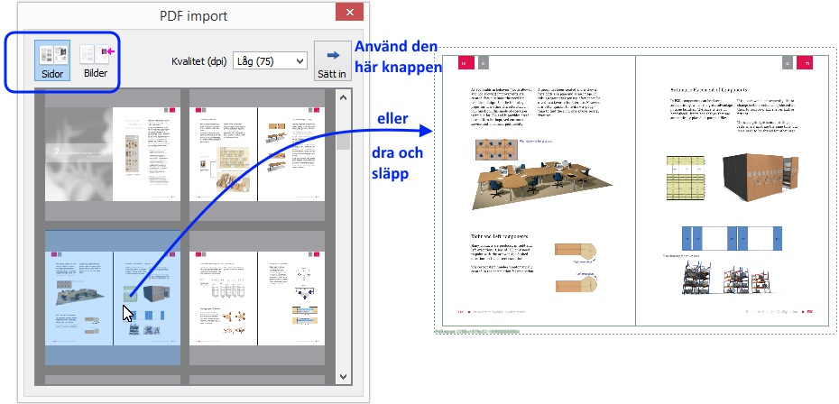 klicka på knappen Sätt in längst upp till höger. Detta placerar sidan på muspekaren. När du har klickat ut den på önskad plats på ritytan stängs dialogrutan PDF import.